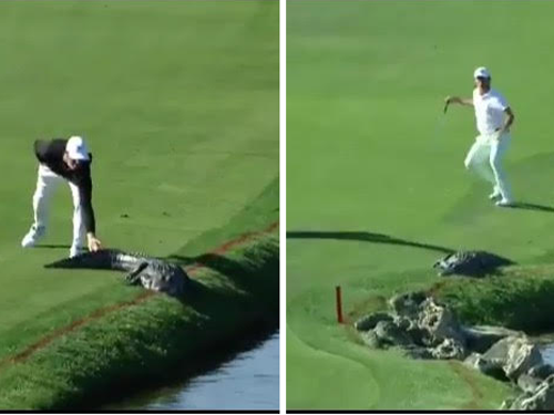 During this weekend’s Arnold Palmer Invitational at Bay Hill Club and Lodge, we saw a potentially dangerous situation handled two very different ways. There are the usual suspects that make the golf course their home, but at Bay Hill Club and Lodge, their wildlife is a little more exotic than what you may have at your course here in Colorado. During the first round, Cody Gribble saw an opportunity to have a little fun with an alligator catching sun while laying by a pond. The frightening/amusing part is that Cody really didn’t even have to go very far out of his way to get some interaction from the alligator. It wasn’t like the alligator was laying off to the side, deep in a water hazard. The alligator was laying on a red lateral water hazard line on a part of the course that players walk right by to get to their next shot. You can see this is evident by the picture (above, right) when Smylie Kaufman absentmindedly walked right up on the alligator as he was making his way to the putting green. His quick reaction to seeing the alligator that close was how I’m sure most of us naturally would react.